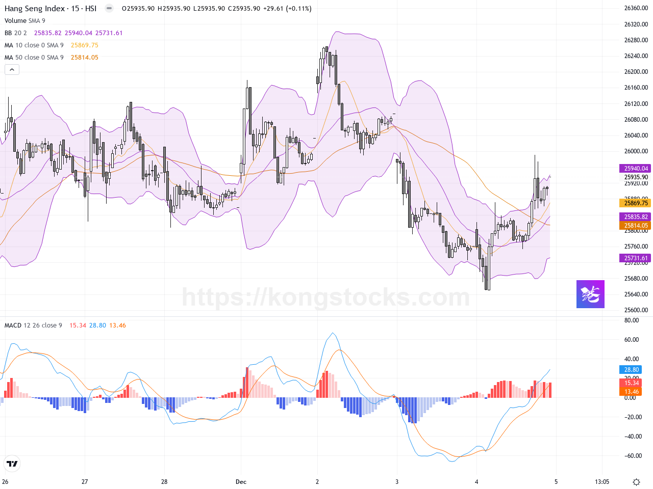 恒生指數 (^HSI) 多時間框架分析 — 執行摘要恒生指數在15分鐘(1日)圖表呈現極端超買及強烈上升動能,但成交量極低且出現異常跳空,短線風險偏高。1小時(5日)圖表顯示盤整走勢並伴隨下行壓力,成交量同樣偏低,技術指標分歧明顯,整體短線偏中性偏謹慎。市場背景:港股今日收報25935.9點,反彈175點,科技股小米及中芯國際領漲,成交量超過千億港元,市場活躍度提升。美國非農數據不佳,降低加息預期,利好股市,但短線仍需關注經濟數據後續影響。