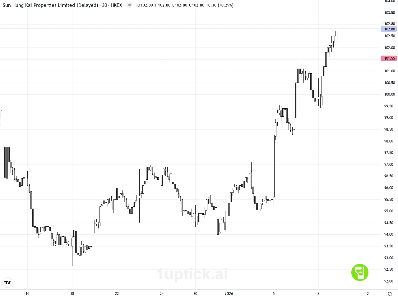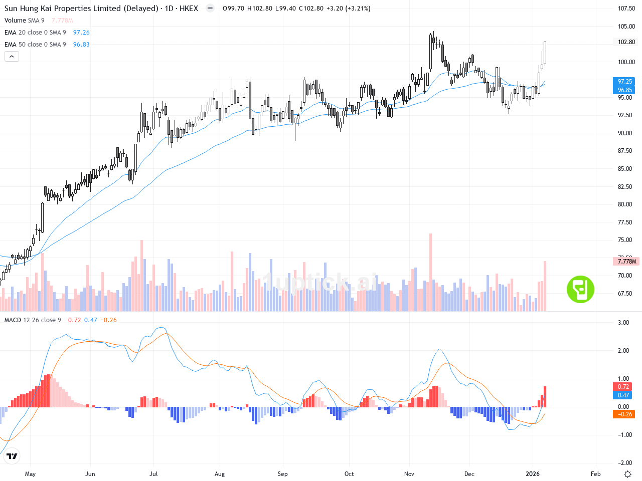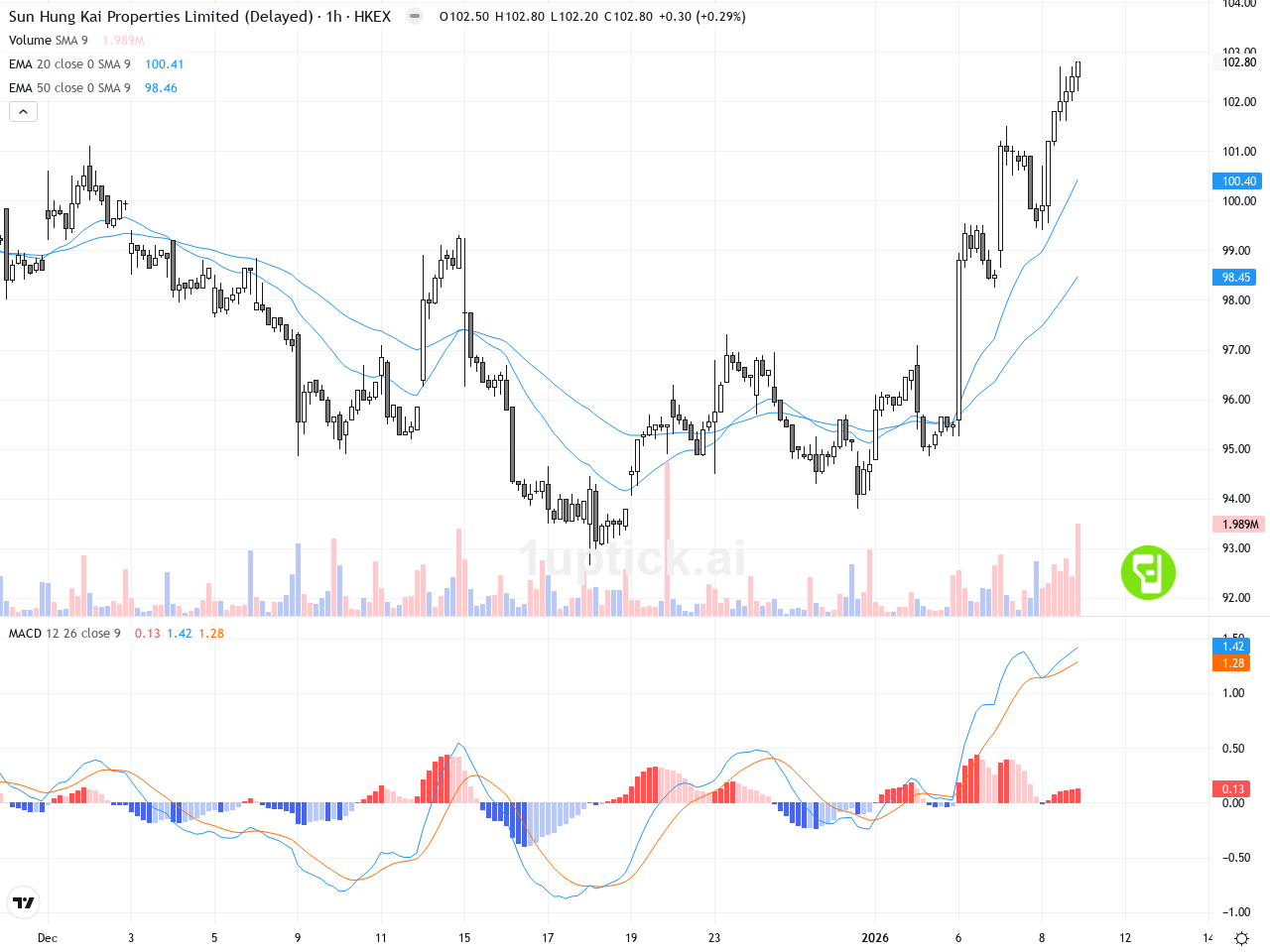 新鴻基地產(00016.HK)近期股價已連續多日上升,最新報102.7港元,較近期多個目標價評估高,市場對香港房地產市場復甦的預期強勁。多家機構如里昂及摩根士丹利均上調該股目標價及評級,認為香港樓市有望持續回暖,帶動新鴻基地產未來表現看好。