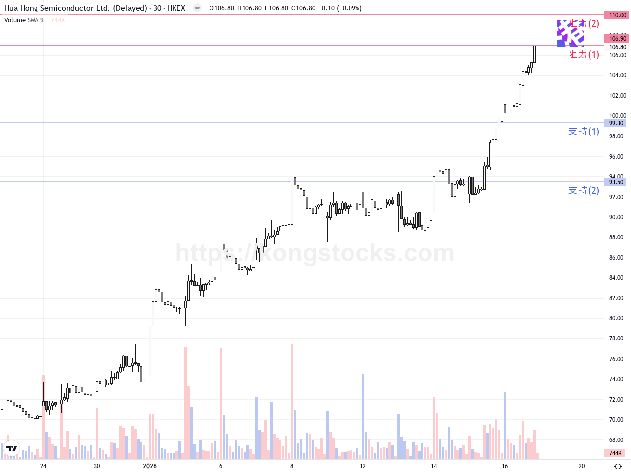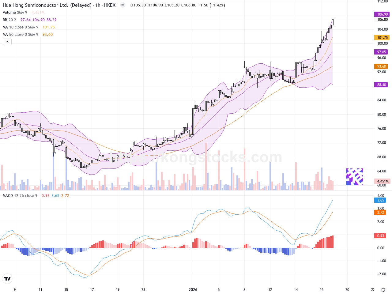 日線圖 – 日線圖顯示華虹半導體處於明顯的上升趨勢中,近十個交易日股價從約84港元穩步上升至當前最高106.9港元。移動平均線呈多頭排列,短期均線(如10日線)持續在長期均線(如50日線)之上,顯示買氣強烈。布林帶擴張,股價接近上軌,反映波動性上升且多頭強勢。MACD指標亦維持在零軸之上,且紅柱放大,顯示動能強勁。日線蠟燭圖中出現了連續陽線,無明顯反轉信號,增強了後市看多信心。