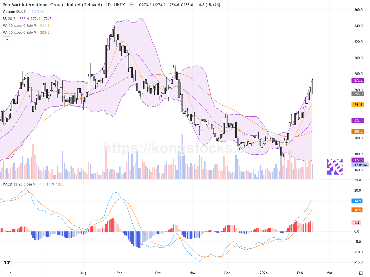 泡泡瑪特(09992.HK)近日股價回落,最新收報255港元,較前日下跌約5.49%。過去10個交易日內股價曾從231港元低位反彈至近274港元高位,但受短線獲利回吐影響,股價有所回撤。市場消息指,泡泡瑪特積極推動IP多元化策略,加上在2026台北燈節雙主燈亮點宣傳下,集團未來增長有望,但短期仍需應對市場對目標價調整的消化。