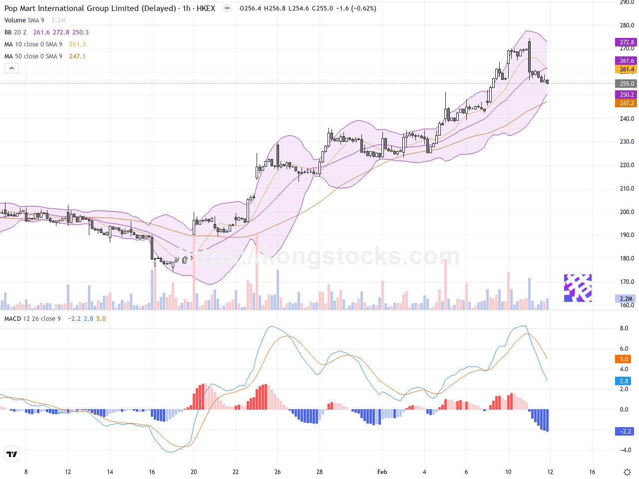 日線圖 – 日線圖顯示泡泡瑪特形成先漲後調的走勢,過去十日中股價由231港元的低點逐步攀升至約274港元的高位,呈現明顯的上升趨勢。但最近兩日出現回調,形成了回撤的蠟燭棒,且收盤在布林帶中軸附近,顯示短期內多空力量開始均衡。移動平均線方面,短期均線(如5日均線)已開始趨於平緩,MACD指標則在正區域震盪,但紅柱有所萎縮,顯示上升動能有所減弱。日線上無明顯的反轉形態,如十字星或吞沒形態,但成交量波動顯示市場觀望情緒加重。