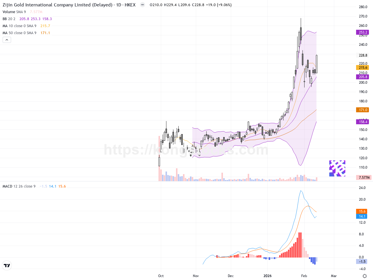 紫金黃金國際(02259.HK)近日股價表現強勢,最新報價228.8港元,較前日大漲約9.056%。近期黃金行情持續走高,帶動相關黃金股包括紫金黃金國際大幅反彈。市場消息指出,公司去年淨利增長約六成,且對未來三年產量提供規劃,加上現貨金價回升至5000美元以上,激發投資者買盤熱情,推動股價反彈至近一年高位。