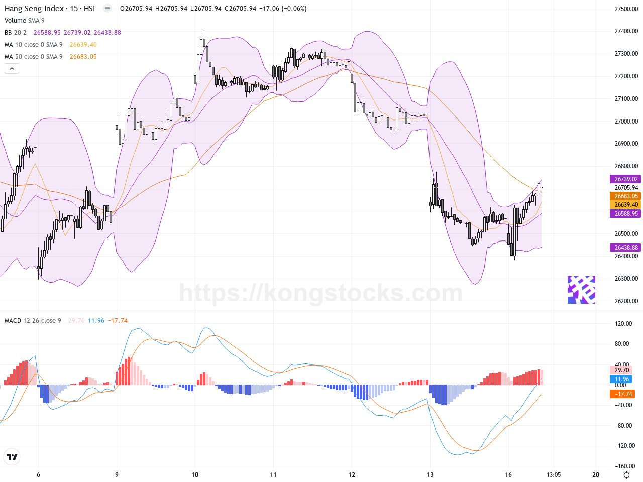 恒生指數(^HSI)於2026年2月16日的短期技術信號呈現分歧。15分鐘圖顯示明顯多頭趨勢,配合偏高的RSI與強勢MACD支持短線正面動能,但1小時圖反映中期空頭壓力較大,波動幅度較大並且MACD指標顯示空頭動能顯著。整體市場氣氛保持活躍,指數今日收報26,705.94點,較昨日收盤26,567.12點上升了約0.53%。今日內波幅較大,最低觸及26,382.41點,最高達26,734.41點,反映市場短期有顯著波動。