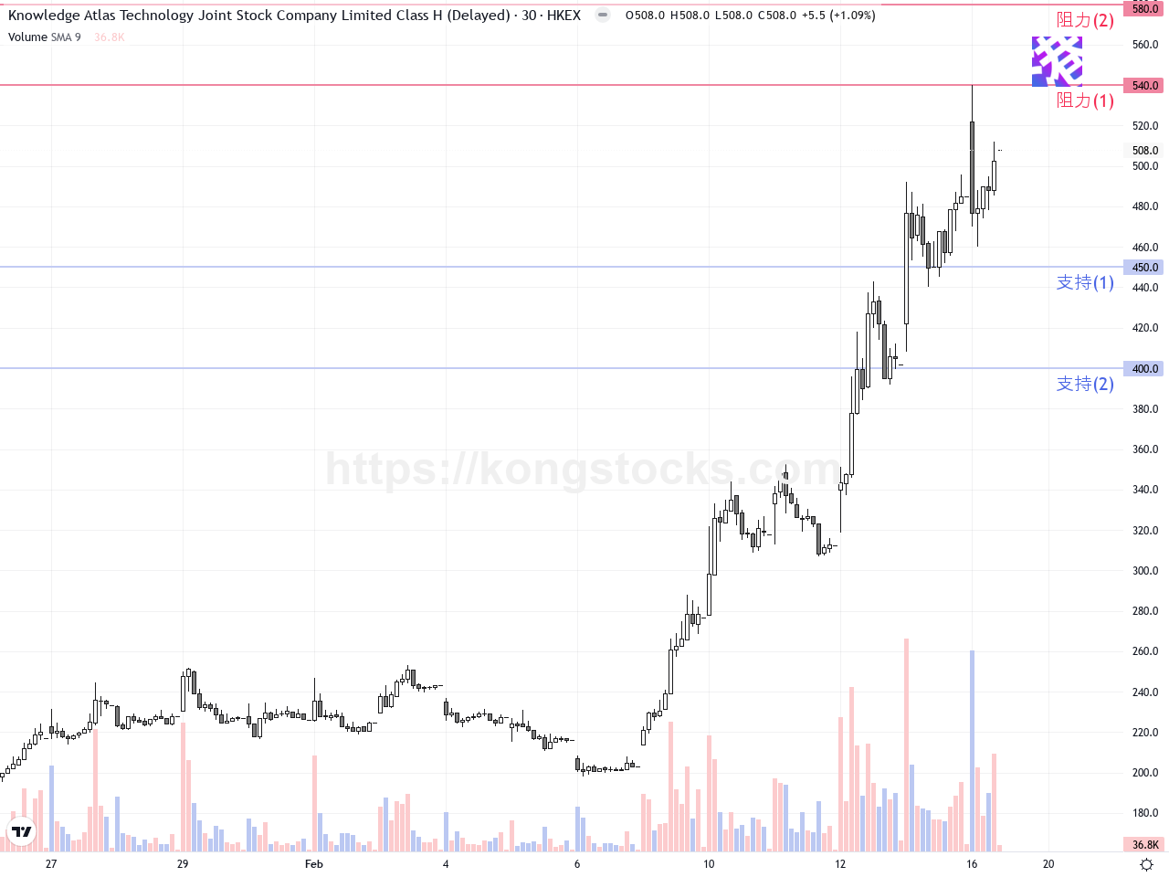 成交量持續放大,配合股價上揚,顯示買盤積極且資金流入強勁。短中期技術指標均呈多頭,股票動能強勁,有望在未來數日維持上攻態勢。若股價能有效突破540港元近期高點,將開啟新一波上升空間。注意關注近期的回調壓力及成交量變化,避免短線過熱風險。目前智譜股價正處於明顯的多頭上升趨勢中,短期和中期均保持強勢。昨日股價突破關鍵阻力並收出帶量陽線,確認後市趨勢向上,預期未來數天股價將繼續領漲。