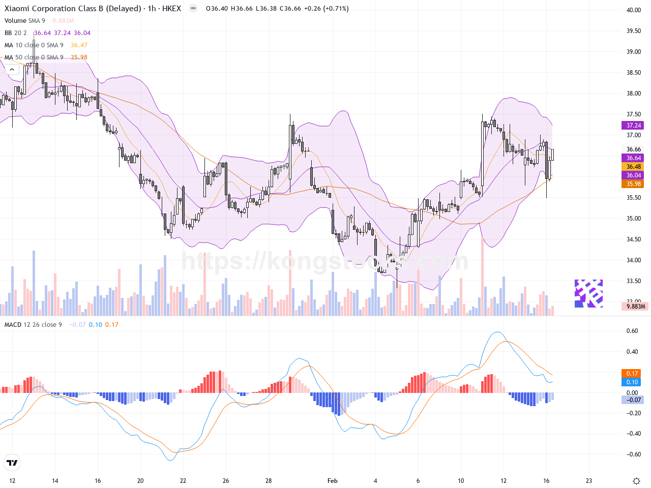 日線圖 – 日線圖顯示,小米股價在過去10個交易日中走出一個初步的上升趨勢,高位約37.5港元,低位約33.3港元。技術指標方面,移動平均線呈現多頭排列,短期均線位於長期均線之上,顯示多頭主導。布林帶寬度適中,股價在中軌附近震盪,未見遠離布林帶上軌的過熱訊號。MACD指標在零軸上方徘徊,動能持續但略有放緩。日線K線中見到數個小陽線夾雜小幅十字星,顯示多空爭持但整體偏向穩定。技術上未見明顯的反轉形態。