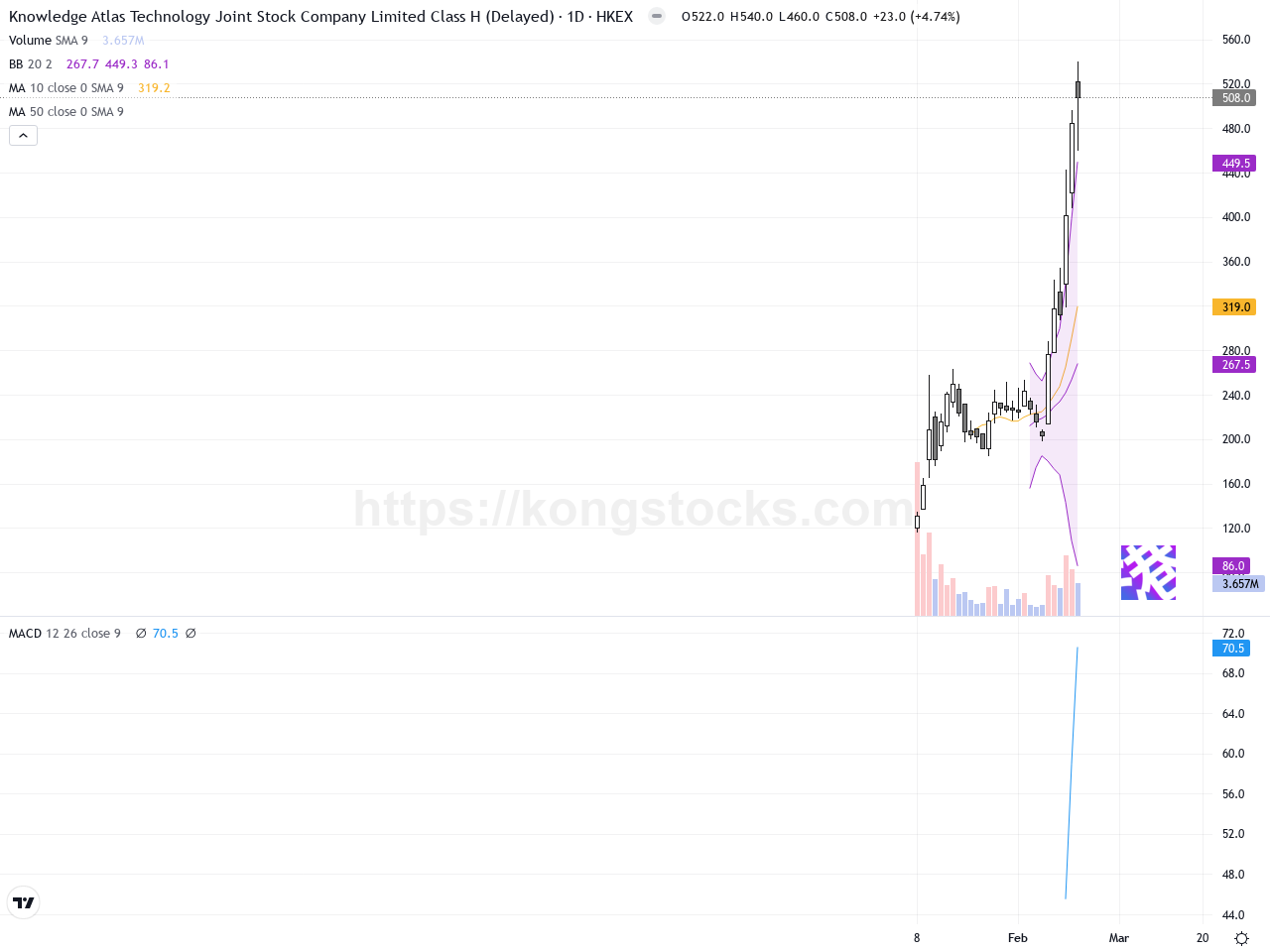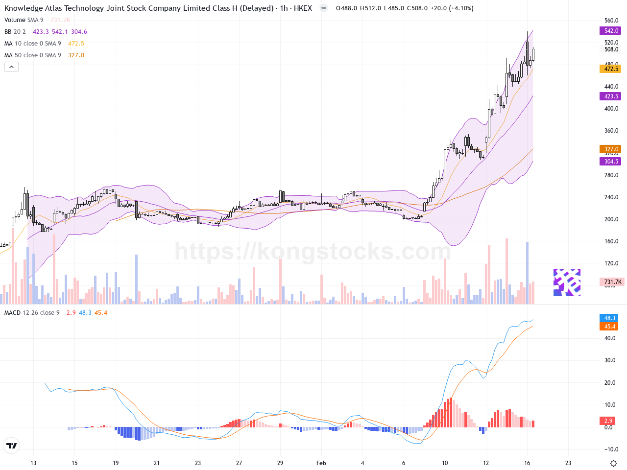 日線圖 – 從日線圖來看,智譜呈現明顯的强劲上升趨勢,股價從約200港元持續攀升至目前超過500港元。日線上可見多處高量成交配合股價上升,顯示買盤強烈支撐。技術指標方面,股價穩定站上多條重要移動平均線,並且Bollinger Bands帶寬有所擴大,顯示波動性增強且上攻動能強。MACD指標目前呈現多頭排列,快線持續高於慢線,顯示強勁買入動能。日線K線中,有幾根帶長下影線的錘子線及多個陽線,顯示多方控盤。整體日線技術結構健康,具備持續吸引資金的潛力。