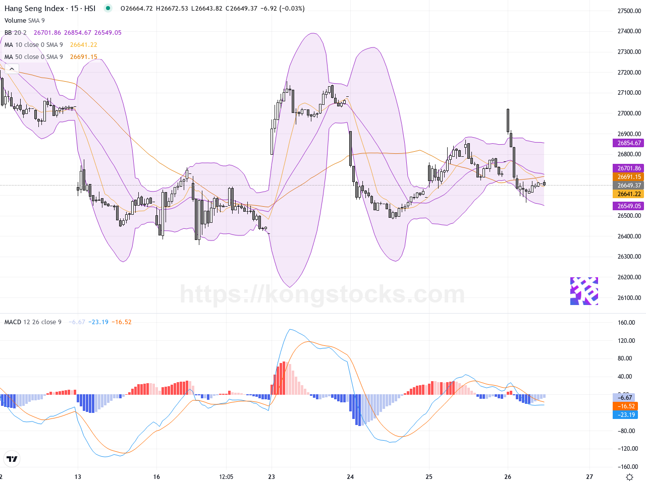 恒生指數目前短期呈盤整走勢,15分鐘圖顯示側向盤整,1小時圖趨勢偏弱但尚屬中立。成交量在兩個時間框架均持續下降,短期動能不足。整體市場情緒偏中性,滙豐控股再創新高帶動部分藍籌股表現強勢,但整體指數波動收窄,投資者觀望氣氛濃厚。現時為盤中交易時段,須留意後續宏觀及企業業績影響。