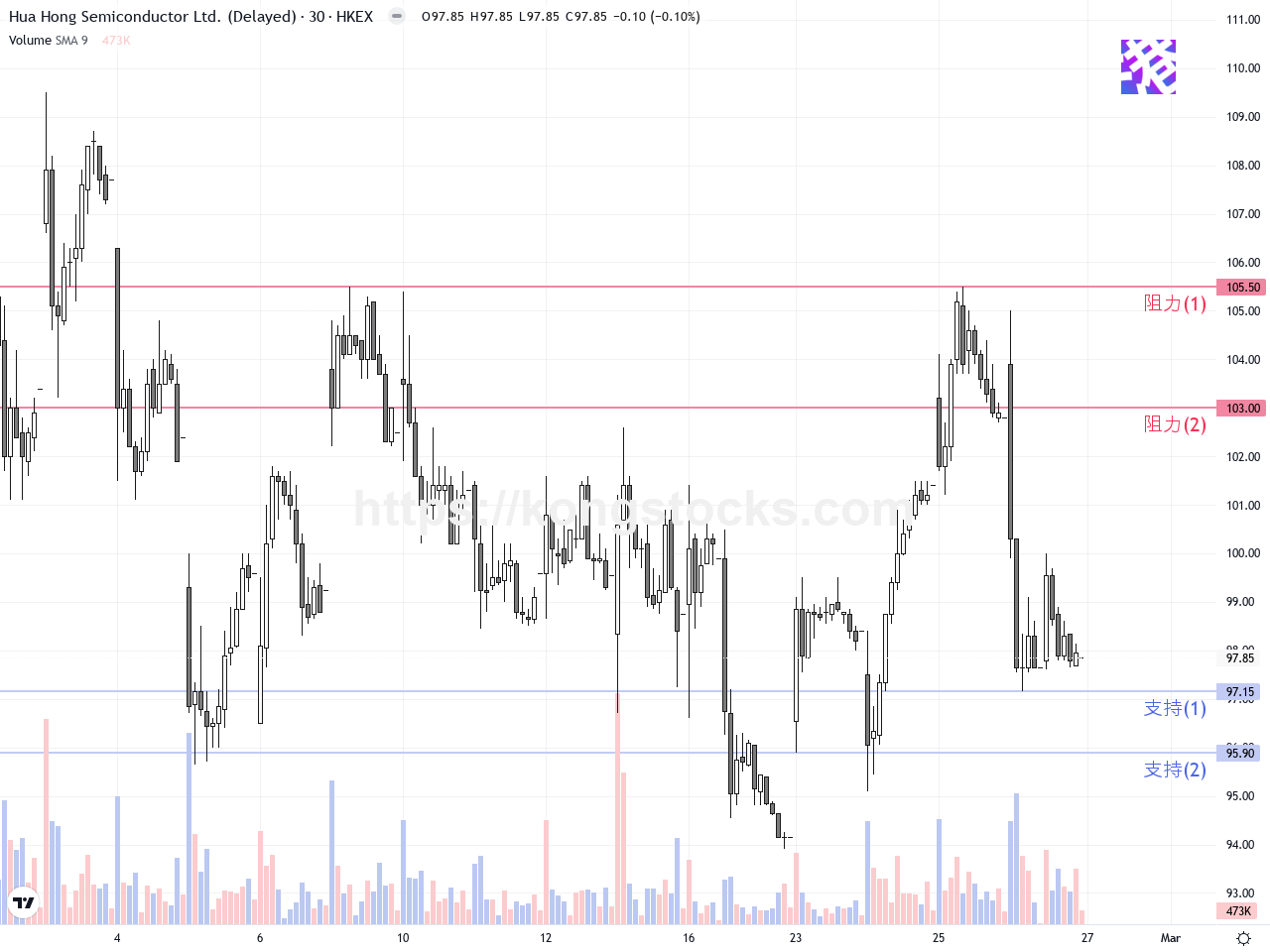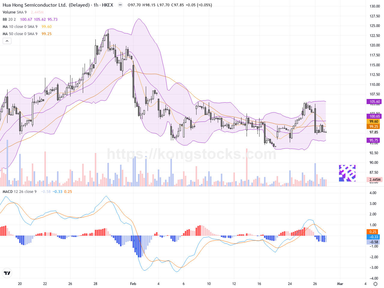 成交量方面,昨日交易量顯著增加,表明拋售壓力加重,但同時也有買盤於低位接手,反映市場存在較強支撐。觀察成交量與價格關係,有助判斷短期底部形成可能。股價已從前期高點回調,但未來幾日若能守住關鍵支撐並放量反彈,技術面將偏向多頭回歸。此外,市場整體半導體板塊因產能擴張利好消息,可能為華虹中長線走勢提供支持。從目前技術面判斷,華虹半導體處於一個短期調整階段,整體趨勢仍屬中期上升趨勢下的整理盤。昨日出現的十字線暗示短期多空雙方達成平衡,短線可能以整理震盪為主。未來幾天的價格動向取決於是否能守住97.15港元的支撐位置,若守住,將有望繼續挑戰近日高位;若破位,則可能進一步下探。