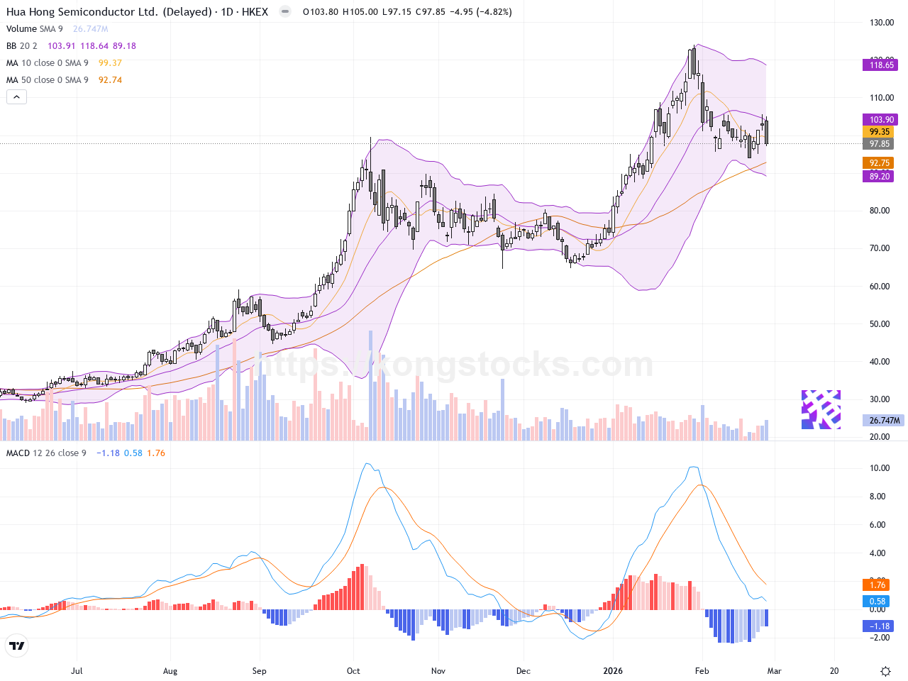 日線圖 – 日線圖顯示華虹半導體股價在近期反覆試探50日均線及布林帶中軌附近支撐,昨日形成帶有長下影線的十字線(Doji),暗示買賣雙方在此價位存在較大分歧,短線或有震盪整理的跡象。MACD指標趨勢逐漸趨於平緩,顯示動能有所減弱。布林帶呈現縮口趨勢,顯示波動率下降,有待後續放量確認方向。整體日線趨勢尚未改變,仍存技術性支撐,但需警惕若跌破97.15港元重要底部,可能引發進一步調整。