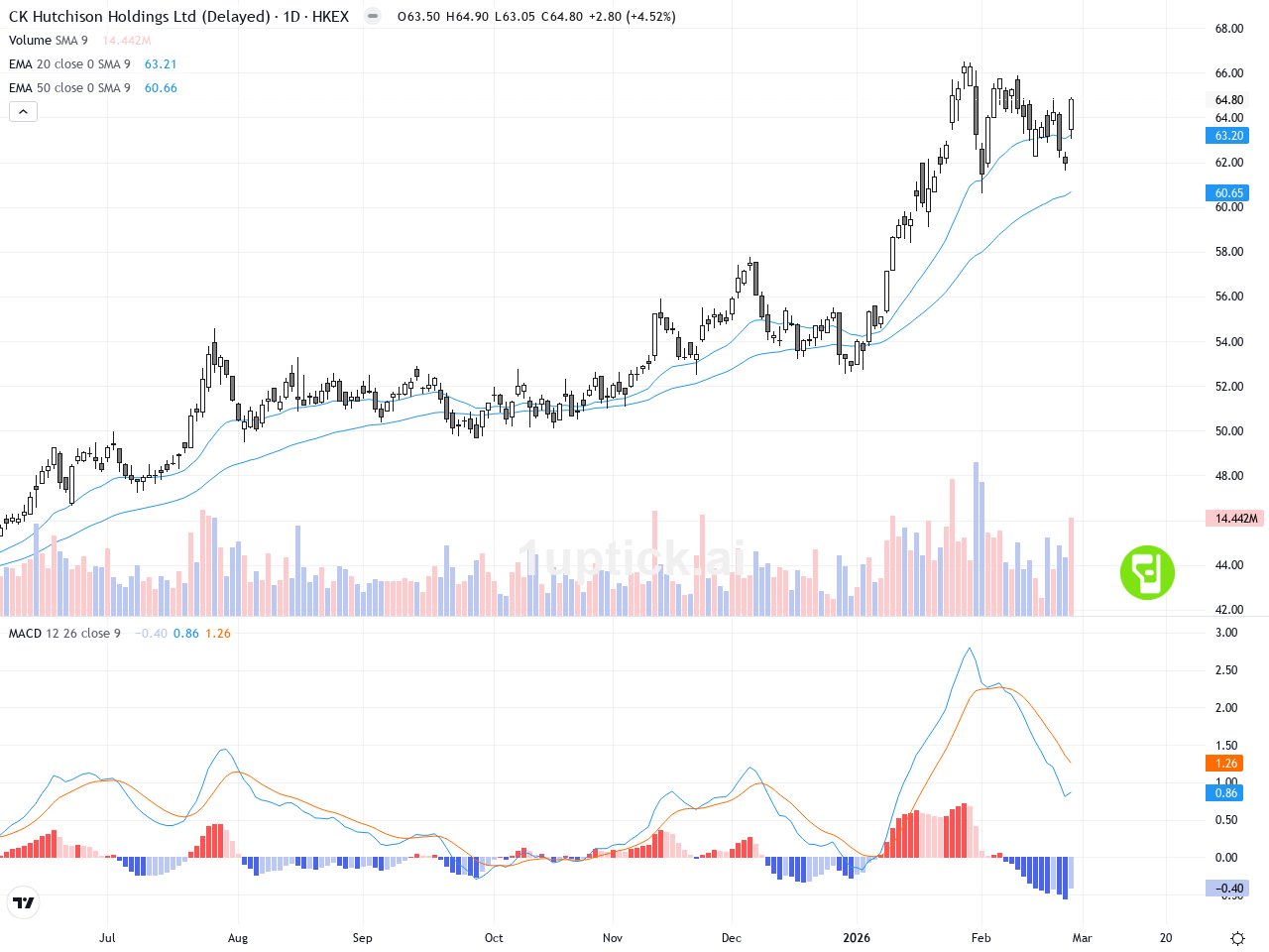 價格結構: 現價: 64.8 目前 0001.HK 出現「密切關注」訊號,日線結構仍具一定支撐,小時線價格與量能值得持續追蹤。 阻力: 66.2101 支持: 64.1453 |