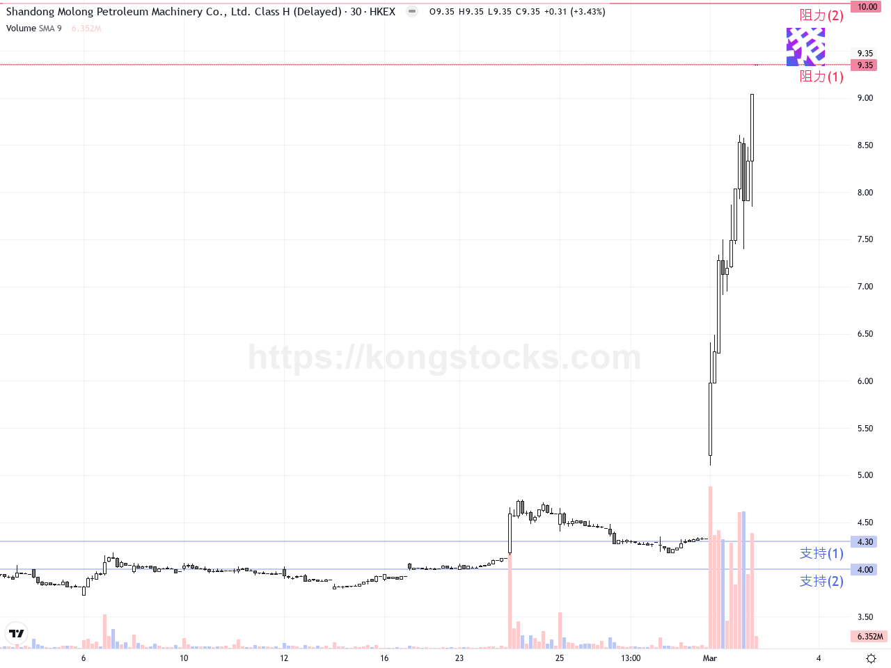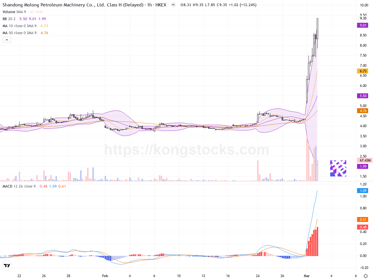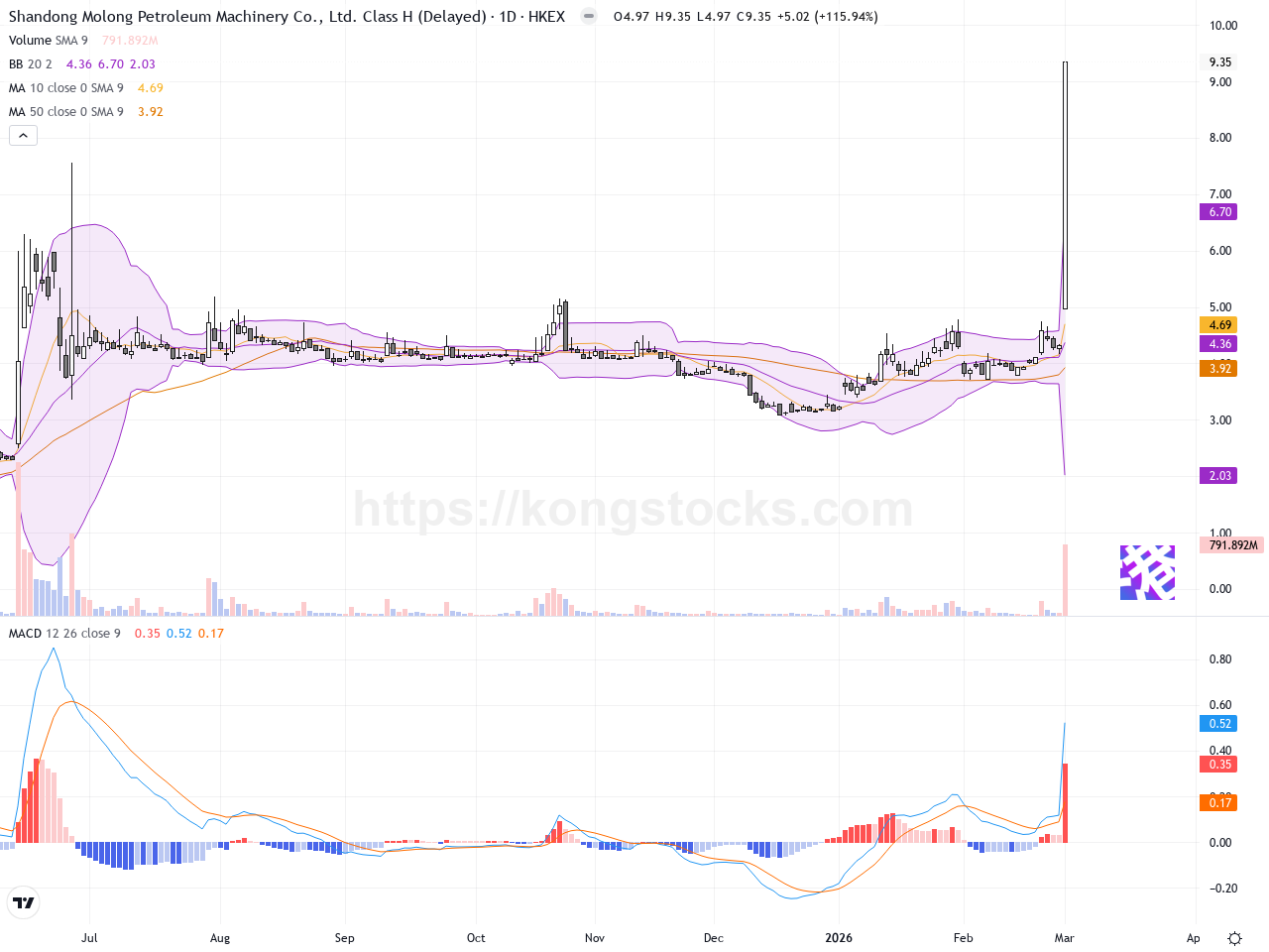 日線圖 – 日線圖顯示山東墨龍形成強烈的上升趨勢,價格從約4港元穩步攀升至9.35港元,中間多個交易日收盤價接近或創新高,表現出堅實的買盤推動。股價突破前期高點後乖離明顯,短期均線呈現多頭排列,布林帶向上開口擴大,顯示波動率提升且趨勢明朗。MACD持續在零軸以上,快線與慢線空間擴大,為強力多頭信號。日線中偶見一兩根長上影線,暗示短線可能有獲利回吐壓力,但整體趨勢依然強勁。