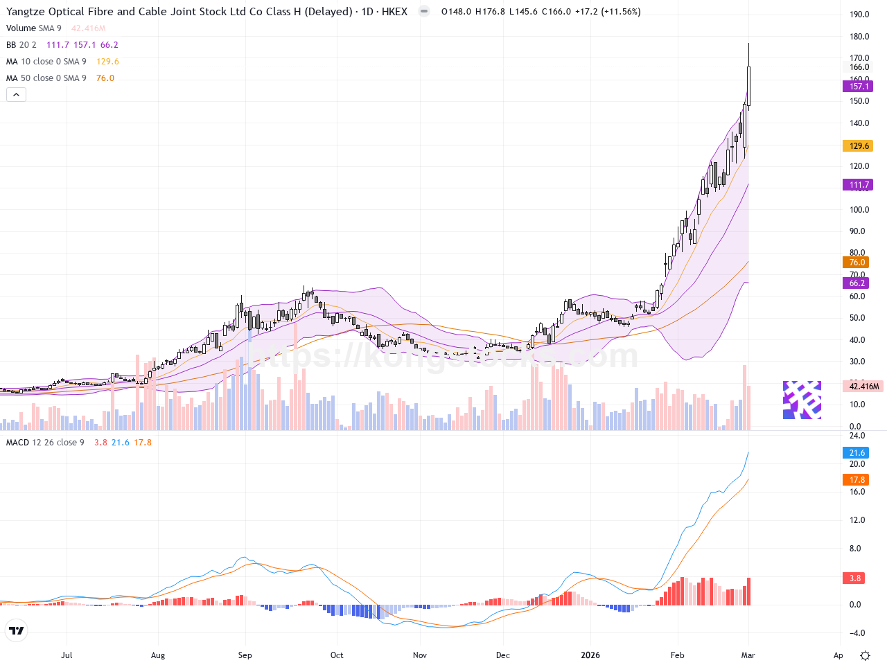 日線圖 – 日線圖顯示長飛光纖光纜正處於明顯的上升趨勢,過去十個交易日股價由約110港元震蕩攀升至166港元,期間多數交易日在布林帶中上軌運行,顯示多方強勢推動。移動平均線呈多頭排列,短期均線(如5日、10日)穩步抬升,MACD柱狀圖明顯放大且快慢線維持黃金交叉,技術指標呈現強烈買入訊號。近期形成多根陽線,無明顯反轉K線形態,反映買盤積極。整體看,日線圖拉出強勁上行動能。