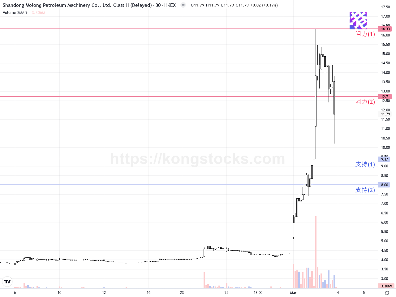 成交量方面,本輪反彈出現爆量,是股價大幅上漲的重要推手。日線及小時線MACD均保持正向動能,均線彎頭向上且多條均線呈多頭排列,量價背離不明顯,短期行情可望延續。需留意股價日內是否會有獲利回吐造成的短暫調整。此外,國際油價持續維持高位,對油服股的資金支持也提供正面推動力。整體評估,山東墨龍目前處於明顯的強勁上升趨勢,短中長期多頭格局鞏固。昨日的強勢陽燭及放量行為,增強後市續攻信心,短期價格有望繼續挑戰更高阻力水平,暫無明顯調整跡象。