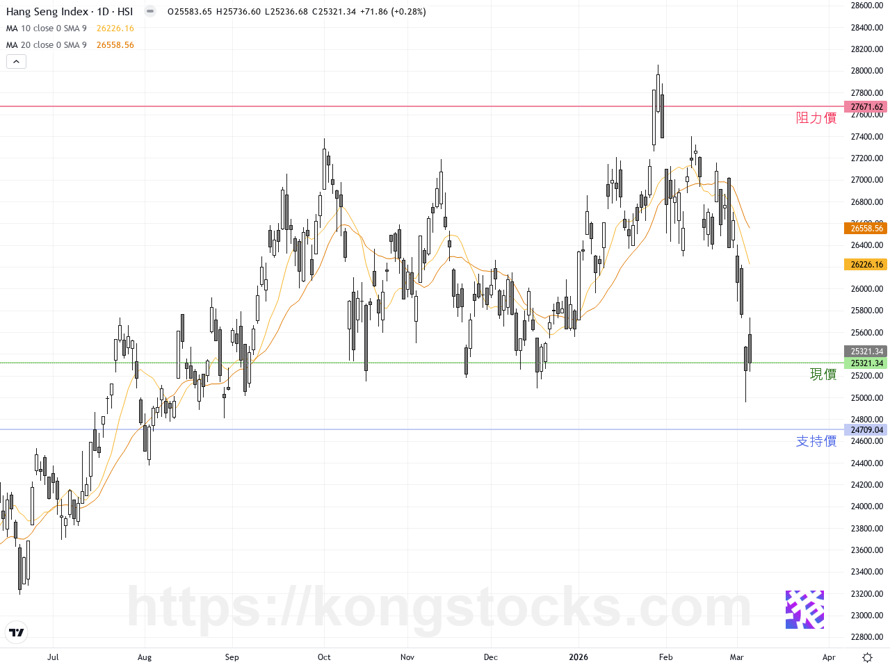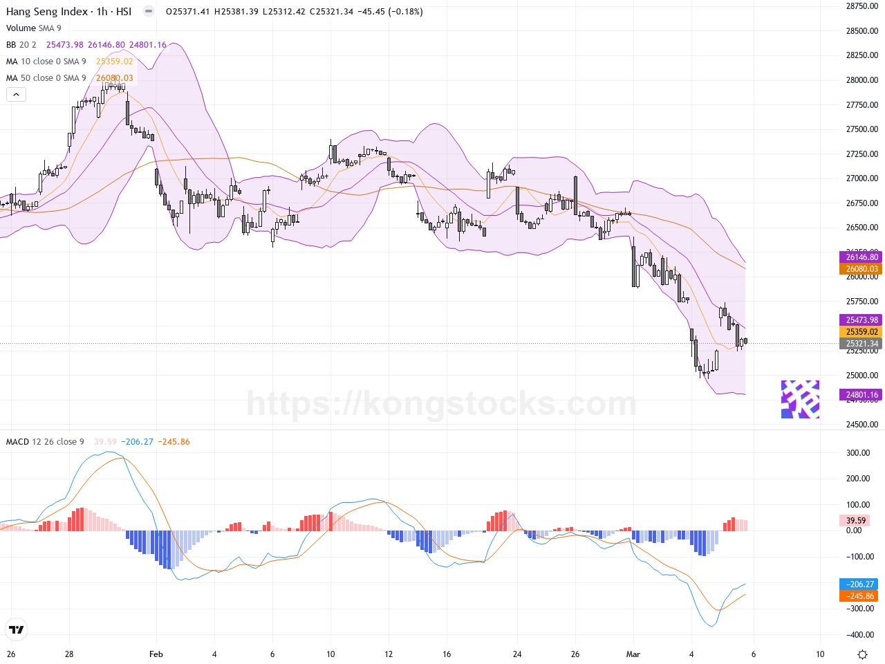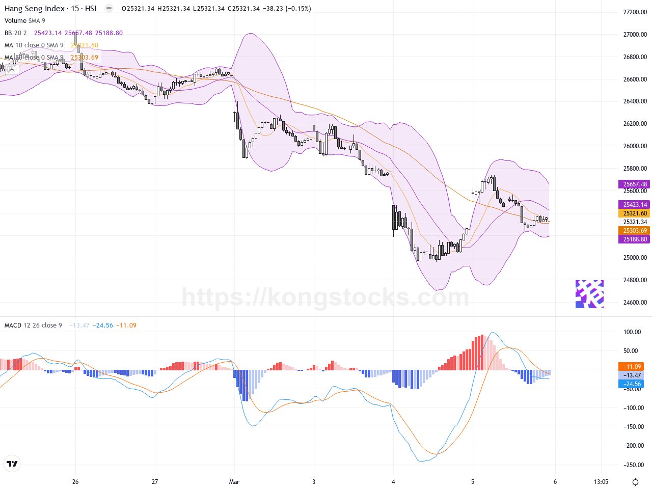 恒指於2026年3月5日收報25,321點,較昨日收盤下跌幅度輕微,但整體呈現短期下跌趨勢。15分鐘及1小時圖均顯示明顯的下跌壓力,RSI指標偏弱且MACD持續負值,表明賣壓依舊存在。今日最高至25,736點,低見25,236點,波動幅度較大。