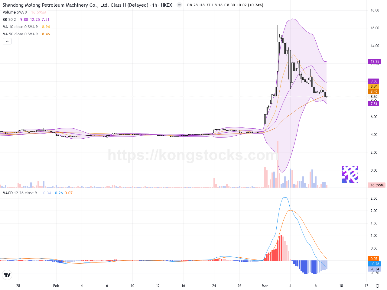 山東墨龍(00568)近日股價出現顯著波動,最新收報8.30港元,較前一交易日下跌4.598%。過去數日股價曾一度衝高至9.35港元,受市場消息及A股聯動影響,先後有過暴升九成及挫逾一成的劇烈波動。近期市場對油服板塊的利好消息推動股價上升,但短期內高位承壓回落,波動性加大。