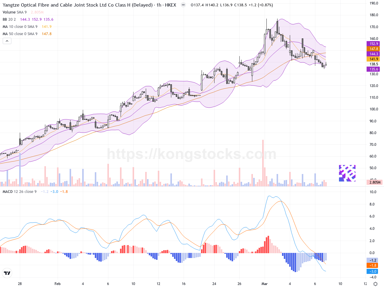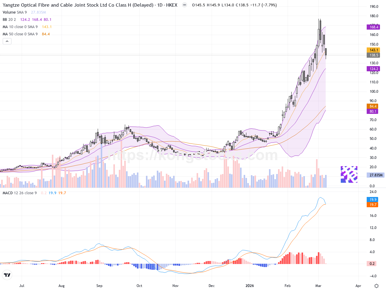 日線圖 – 日線圖顯示,長飛光纖光纜股價在近期經歷一段強勁上升趨勢,最高觸及約176.9港元的52週高位,但隨即出現回調跡象。股價跌破10天簡單移動平均線,反映短線多頭動能減弱。布林帶開始呈現收口狀態,顯示波動率下降。MACD指標由頂部向下交叉,顯示賣壓增加。圖中沒有明顯的反轉型態,但多日連續陰線提示賣方力量增強,需留意支撐位置。