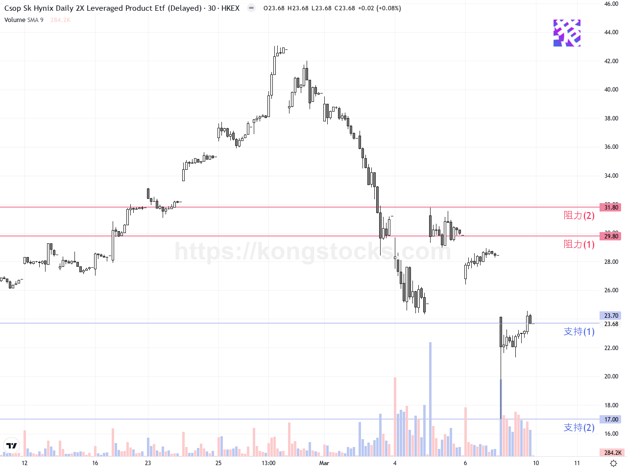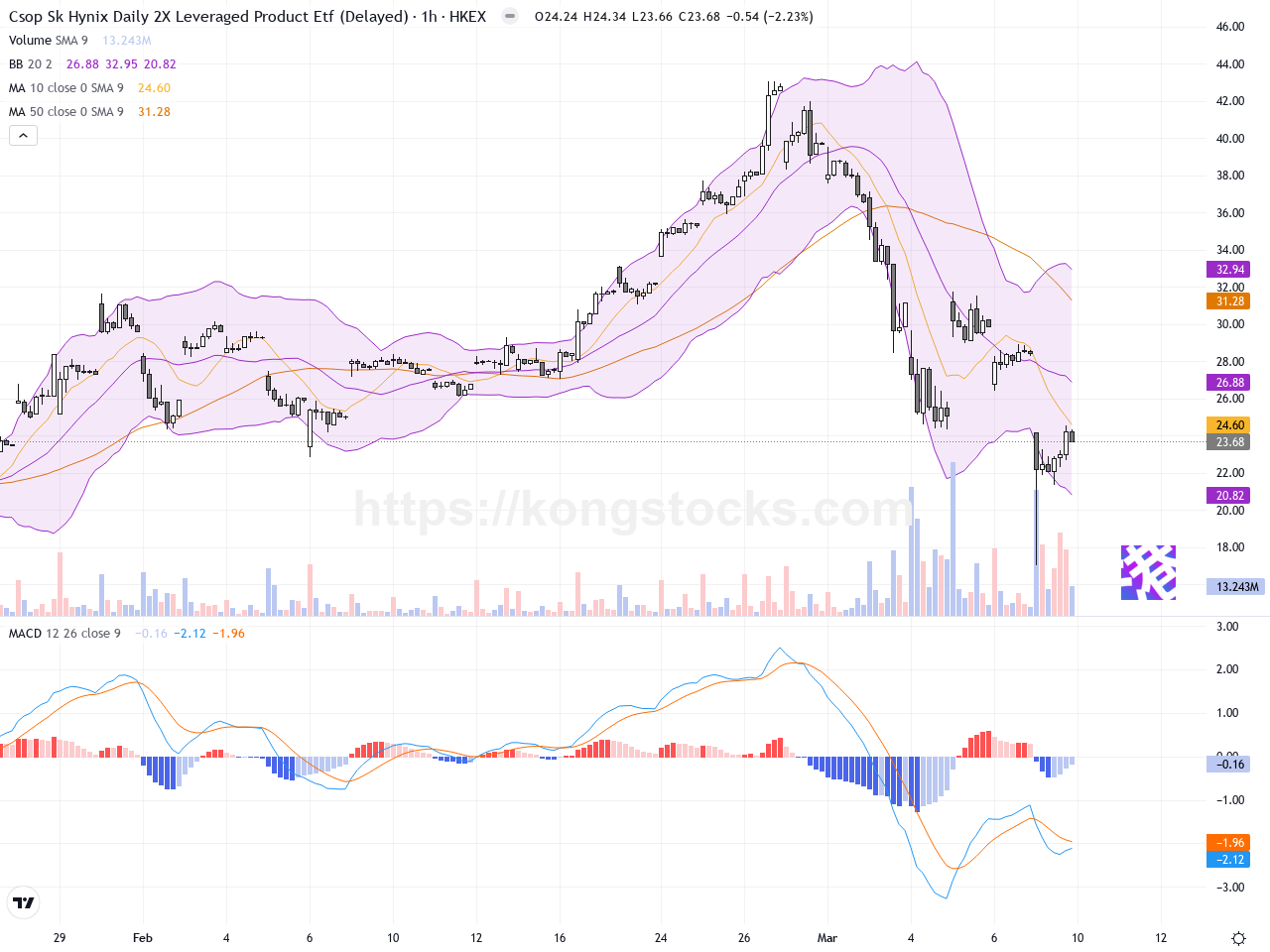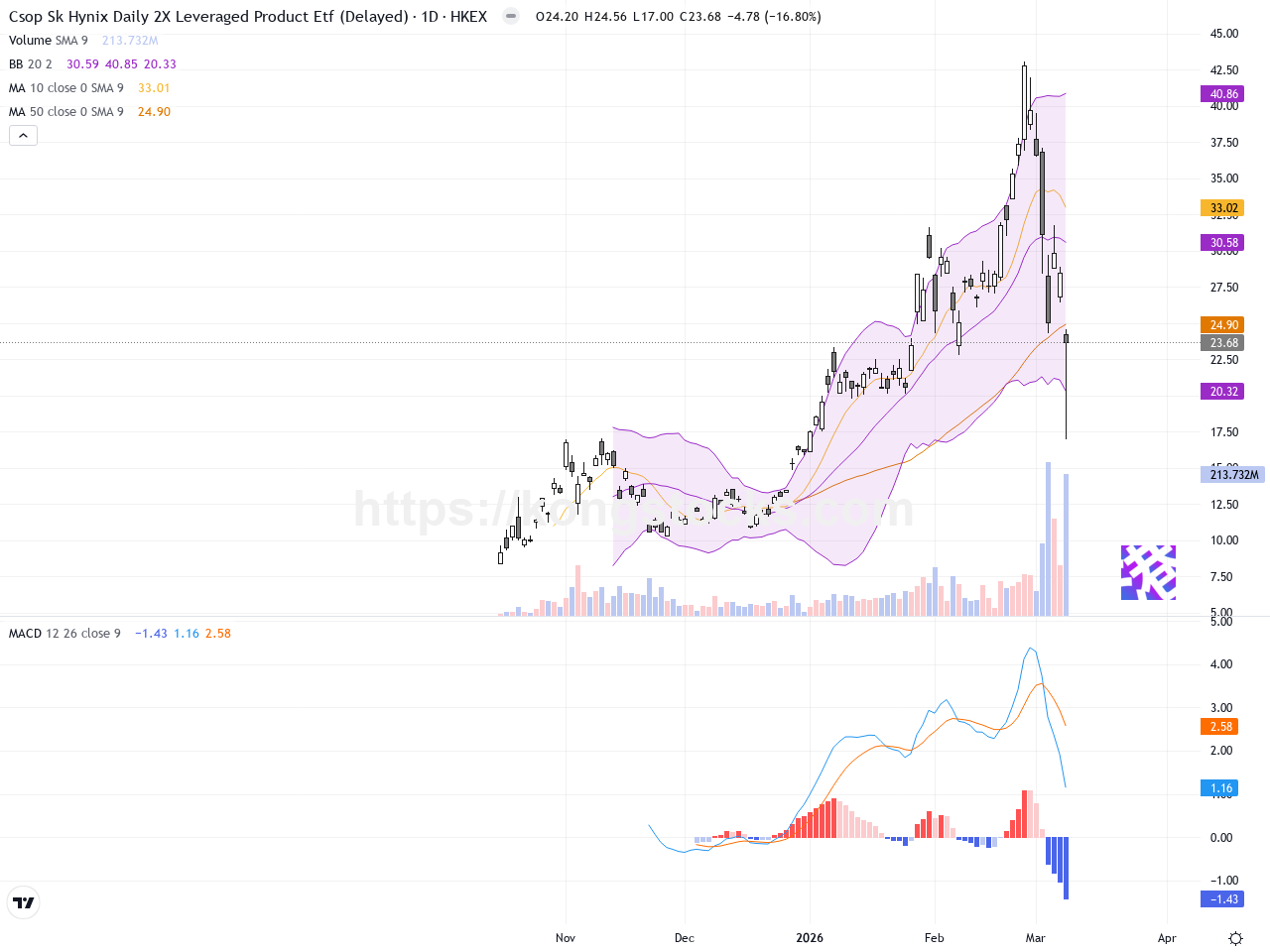 XL二南方海力士(07709.HK)近日股價經歷劇烈波動。過去十日內,股價由高位43.06港元急跌至今日收市23.68港元,跌幅近16.8%。此次急挫主要受市場整體日韓股市大幅回調影響,特別是韓股下跌6%,連帶影響南方兩倍槓桿海力士ETF表現。港股相關槓桿產品今日同步回落,反映市場投資情緒轉趨謹慎。