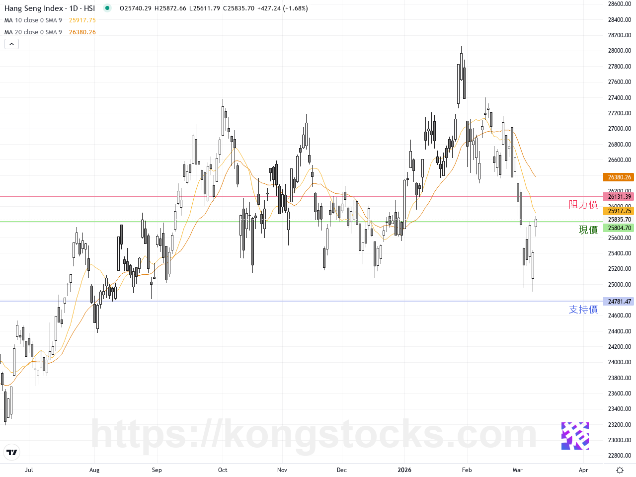 整體而言,恒指於早盤急跌後迅速反彈,表明市場正積極吸納低位籌碼。受中東局勢逐漸緩和及美股反彈影響,港股投資氣氛回暖,但由於地緣風險及宏觀不確定性依然存在,短線市場觀望氣氛濃厚。投資者建議密切留意全球政治動向及經濟數據,以把握後市走勢。