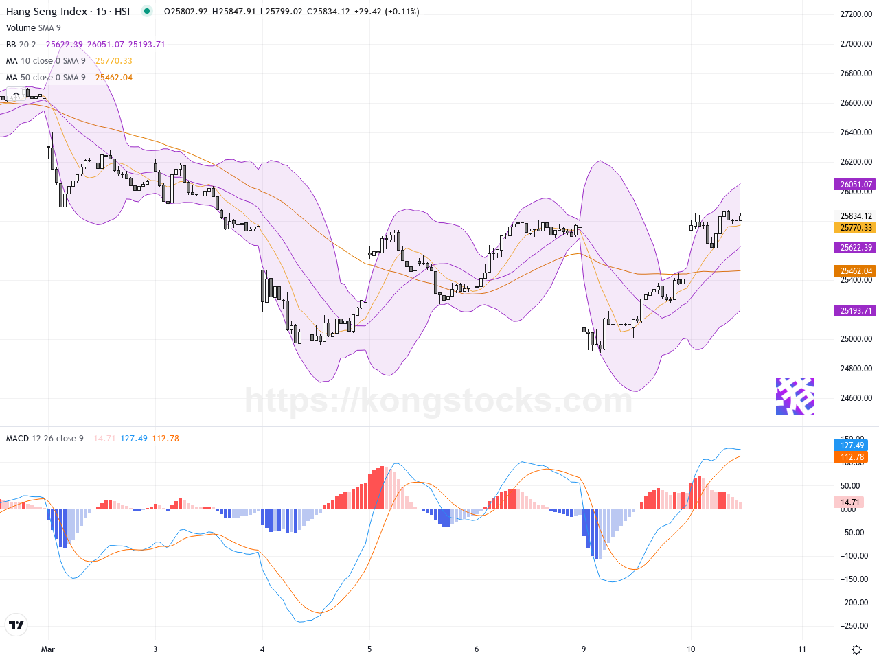 恒生指數今日高開後進一步拉升,午盤收報約25804點,較昨日收市反彈近400點,最高觸及25872點,顯示買盤湧現帶動市場氣氛轉旺。成交量方面未有明顯放大,反映市場仍保持謹慎態度。