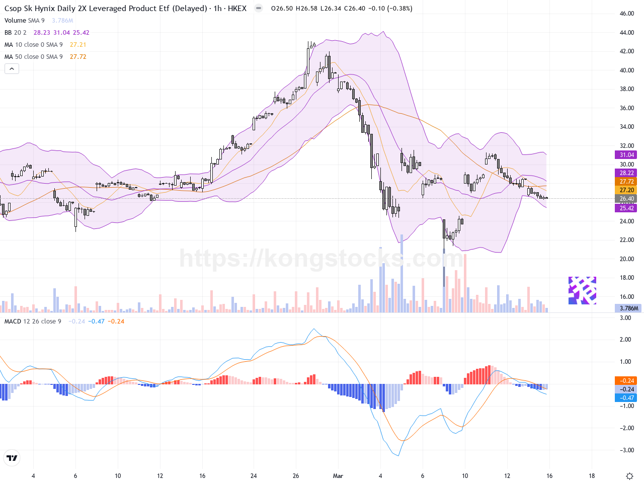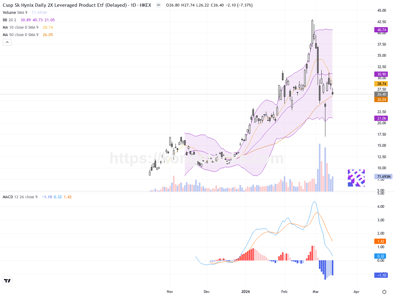 XL二南方海力士(07709.HK)近日股價出現顯著調整,最新收報26.4港元,較前一交易日下跌約7.37%。過去十日內,股價由高位39.74港元跌至現水平,反映出市場近期普遍承壓。當前無明顯新聞消息驅動,價格波動更多源於技術層面壓力及市場風險偏好轉向保守。