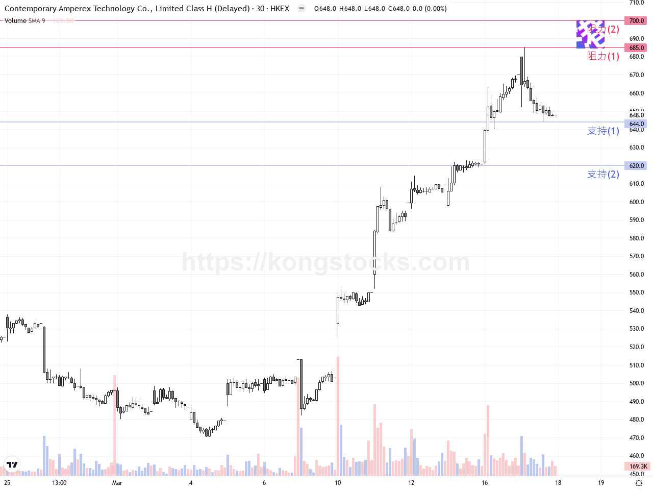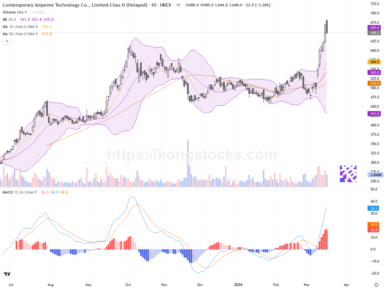 寧德時代(03750.HK)近日再度創出歷史新高,最高觸及685港元,受益於最新財報銷售及盈利表現超預期,加上與福州公交集團簽約等利好消息,吸引市場資金大幅追捧。然而,隨著股票接近短期高位,股價今天小幅回調,跌幅約3.284%,反映市場出現短期獲利了結壓力。