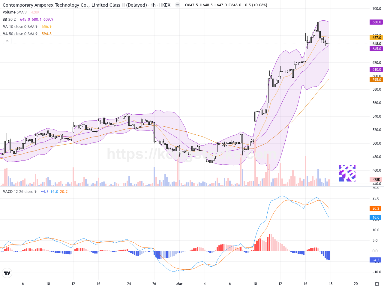 成交量方面,近期放量明顯,配合股價創新高,顯示多頭力量充足。近期成交量雖有回落但仍在較高水準,短期內市場人氣依然強勁。技術指標MACD呈頂背離,短線需關注能否有效守住640港元支撐。布林帶中軸附近的支撐亦為重要觀察點,若跌破將引發回調加劇。整體來看,多頭主導行情,但須警惕短線獲利回吐風險。目前寧德時代處於明顯的多頭上升趨勢,大趨勢向上動能強勁;但短線進入震盪盤整階段,形成整固狀態。昨日出現長上影線並伴隨量能下降,預示短線可能有修正以釋放買盤壓力,未來幾日或在高位整理,為下一波上漲積蓄能量。