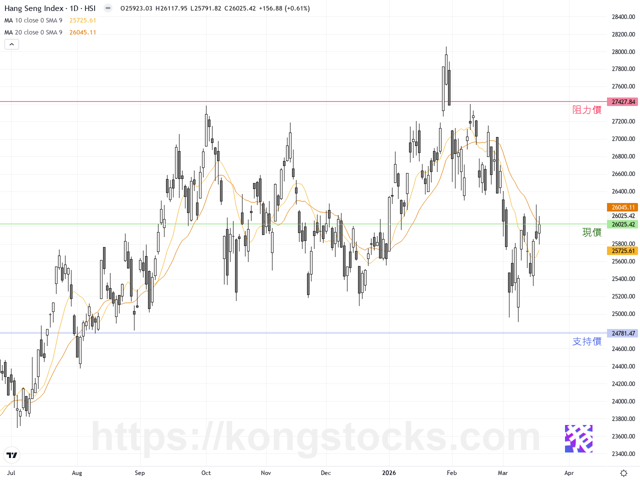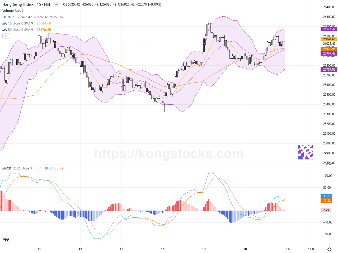 恒生指數於2026-03-18收市報26025.42點,較昨日收市價25249.48點上升約775.94點,表現強勁。當天最高觸及26117.95點,最低25791.82點,整體波動有節制。15分鐘及1小時圖均顯示明顯的多頭上升趨勢,短期動能充足且RSI及MACD指標均屬正面,支持繼續上攻。市場情緒受AI板塊及新興科技股推動偏向積極,但整體成交量較前日減少,反映投資者保持一定謹慎。當前市場環境聚焦於即將公佈的美聯儲議息決定及地緣政治風險,交易者宜留意短線波動風險。