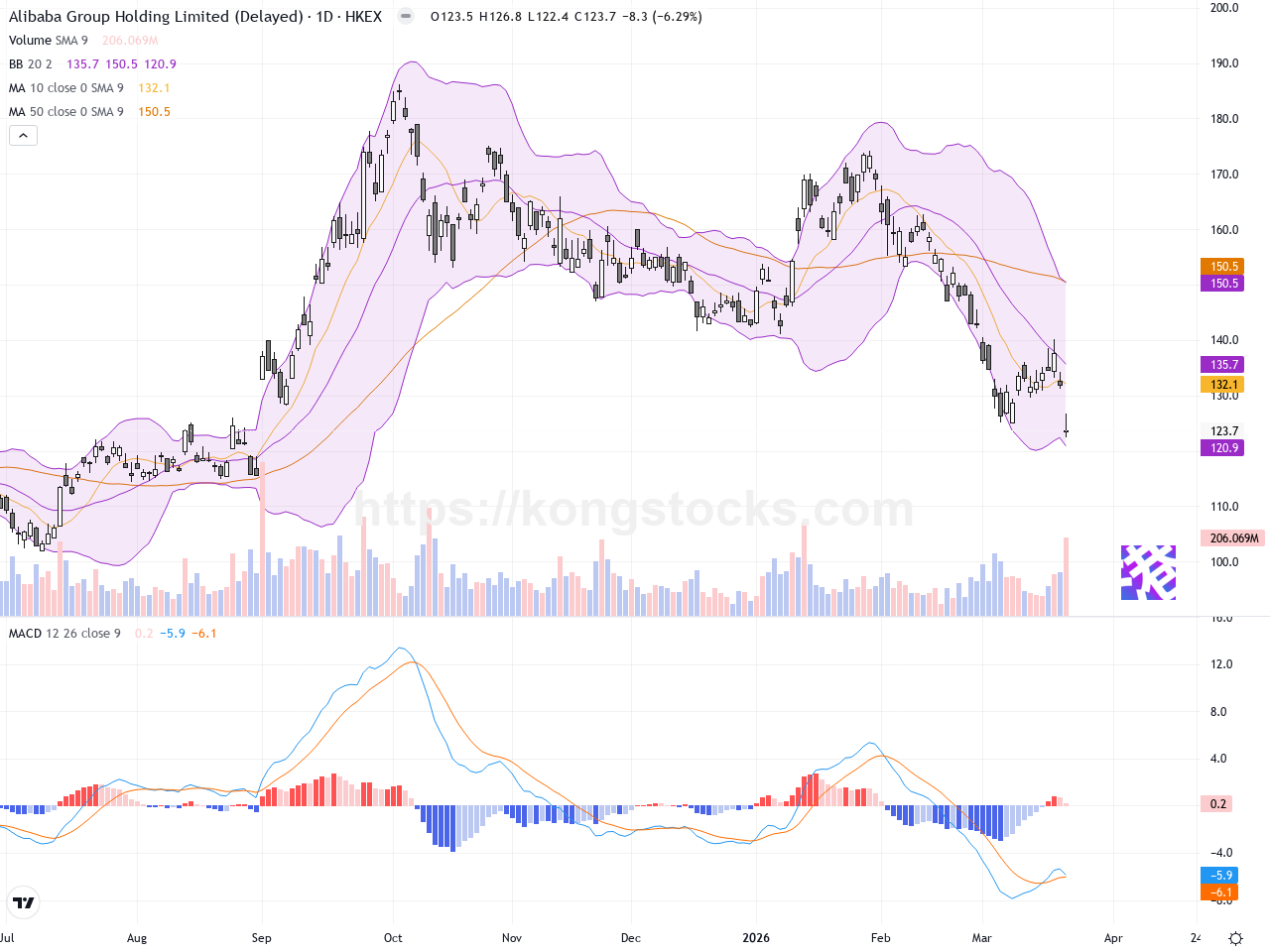 日線圖 – 從日線圖觀察,阿里巴巴呈現明顯的下跌趨勢,股價由高位逐步回落形成連續低點和低高點。日線上的移動平均線(例如20日均線)開始轉頭向下,股價已經跌破中軌布林帶,且靠近下軌,顯示短期有被超賣風險。MACD指標現呈現死叉,動能負面增強。日線K線組合中出現了數根帶有長上影線的陰線,說明賣壓沉重。昨日股價大幅下跌後,尚未出現明顯的反彈信號,趨勢偏向弱勢。