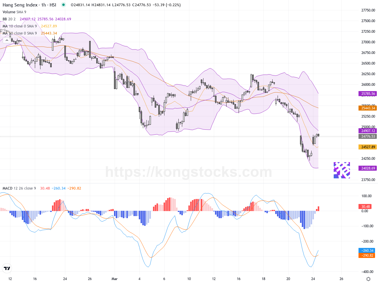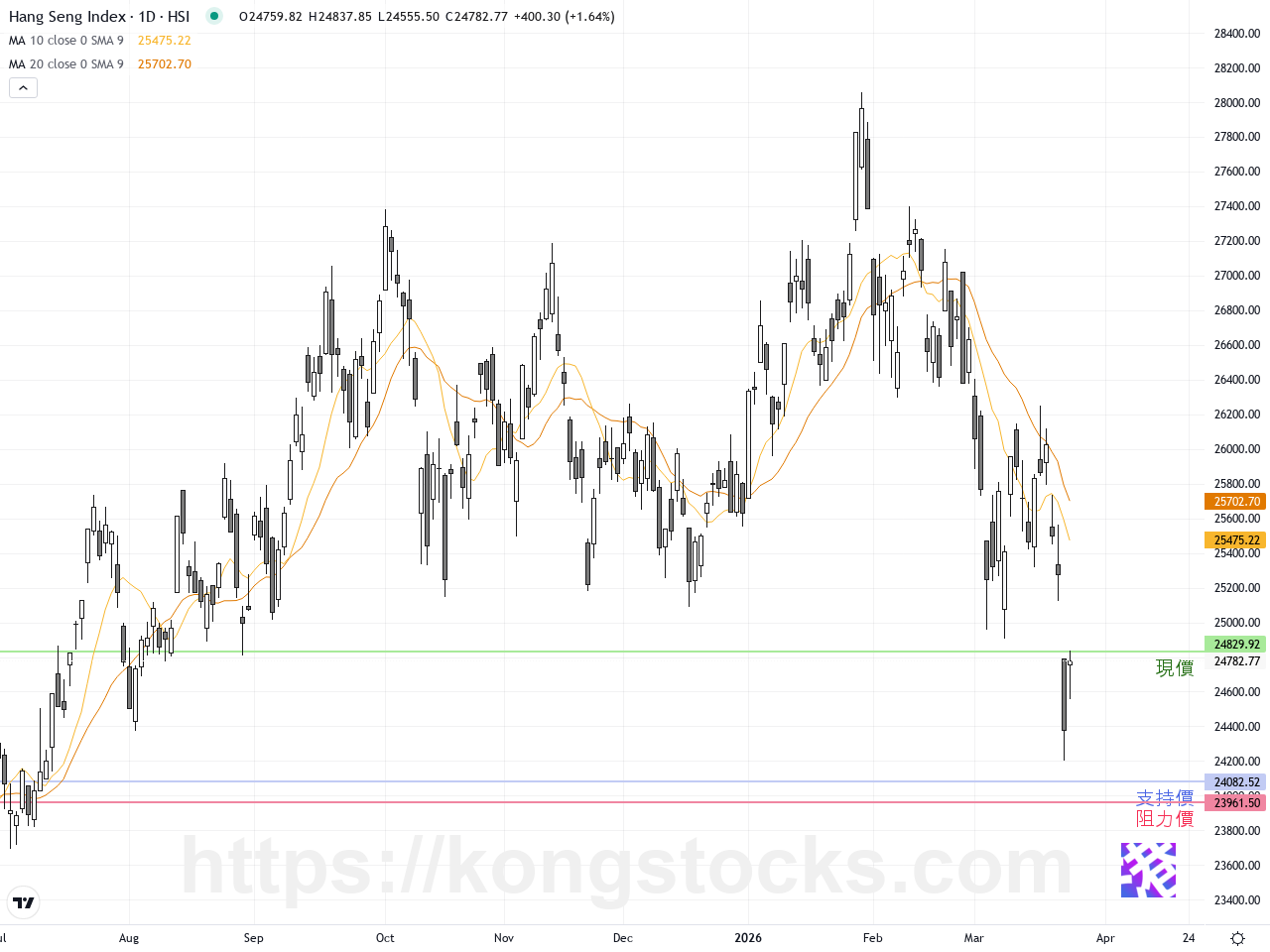 理由: 受到伊朗戰爭憂慮緩解帶動,恒指半日反彈446點,科技股與金融股領漲,市場人氣顯著提升,資金積極流入,短線情緒回暖。然成交金額仍未完全爆發,顯示部分投資者仍偏謹慎。