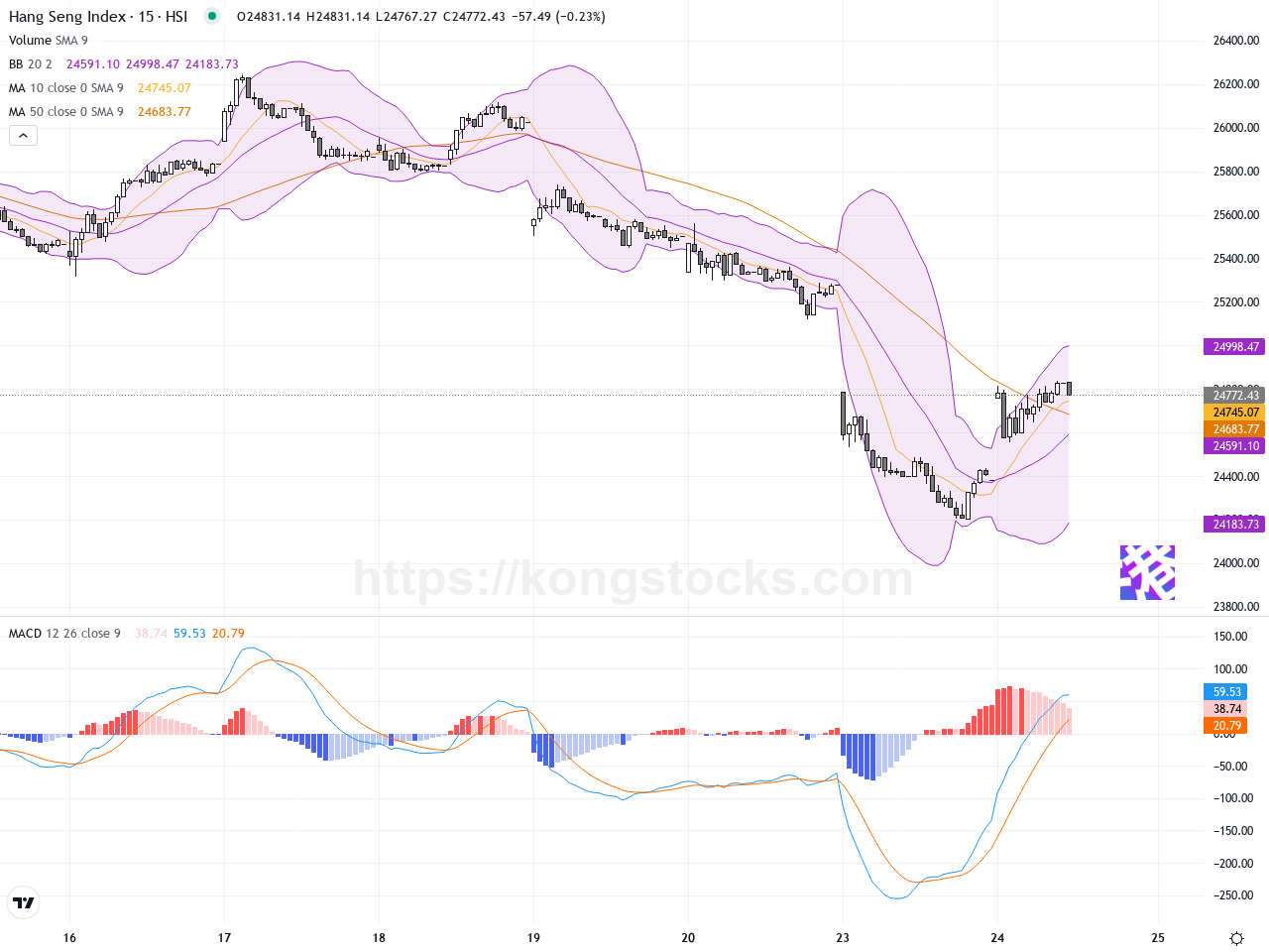 恒生指數於今日早段迎來強勁回升,受惠於伊朗戰爭憂慮紓緩,恒指高開377點後持續反彈,半日升幅達446點,報24830點附近。成交活躍,有效累積買盤進場,推動市場氣氛改善。科技股顯著回暖,恒生科技指數升約1.3%,其中小米股價於放榜前上升約1%。
